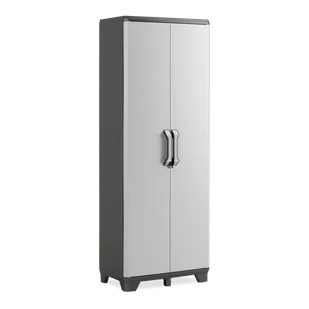 Dostępny w kolorze szaro-czarnym. Cechy: wytrzymała konstrukcja wykonana z wysokiej jakości tworzywa sztucznego – polipropylenu, odpornego na działanie niekorzystnych warunków atmosferycznych wyposażona w 3 regulowane półki (półka wytrzymuję obciążenie do 10 kg) podwójne drzwiczki z uchwytami ułatwiają otwieranie drzwi, przystosowane są również do zamykania na kłódkę (kłódka nie jest dołączona) regulowana wysokość nóżek, dzięki czemu można prawidłowo ustawić szafę nawet na lekko nierównej powierzchni solidna budowa oraz wysoka jakość gwarantują bezproblemowe i długotrwałe użytkowanie, łatwa w czyszczeniu produkt znajdzie swoje zastosowanie w garażu, w warsztacie czy w pomieszczeniu gospodarczym ale również jako dodatkowe miejsce na przechowywanie na balkonie szafa jest przeznaczona do prostego montażu potwierdzeniem najwyższej jakości produktu jest posiadany przez nią certyfikat TÜV Süd GS Wymiary: Szerokość - 68 cm Głębokość - 39 cm Wysokość - 182 cm Ilość półek - 3 szt Ładowność - 10 kg / 1 półka