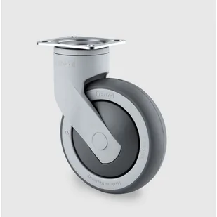 felga koła: polipropylen bieżnik: TENTEprene (szary-niebrudzący, wysokiej jakości materiał syntetyczny, posiada wysoką odporność na wszystkie aktualnie dostępne rodzaje detergentów i środków dezynfekcyjnych) mocowanie: przez płaski kołnierz łożysko: precyzyjne kulkowe z ochroną przeciwko wplątywaniu się włókien odporność na temperatury -20°C do 60°C przeznaczone przede wszystkim do zakładów o podwyższonych wymaganiach higienicznych, szpitali, itp.