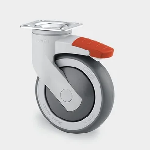 felga koła: polipropylen bieżnik: TENTEprene (szary-niebrudzący, wysokiej jakości materiał syntetyczny, posiada wysoką odporność na wszystkie aktualnie dostępne rodzaje detergentów i środków dezynfekcyjnych) mocowanie: przez płaski kołnierz łożysko: precyzyjne kulkowe z ochroną przeciwko wplątywaniu się włókien odporność na temperatury -20°C do 60°C przeznaczone przede wszystkim do zakładów o podwyższonych wymaganiach higienicznych, szpitali, itp.