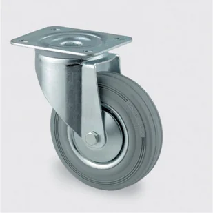 tarcza koła: stalowa ocynkowana blacha bieżnik: szara guma, nie pozostawia śladów mocowanie przez płaski kołnierz łożysko: wałeczkowe z ochroną przeciwko wplątywaniu się włókien odporność na temperatury -20°C do 60°C