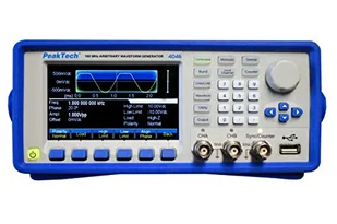 Arbitralny generator przebiegów dwukanałowy 1uHz - 160MHz Peaktech 4046 Ten nowo opracowany generator arbitralny o wysokiej wydajności ma doskonałe parametry techniczne i szeroki zakres funkcji przy wysokiej częstotliwości wyjściowej do 160 MHz. Na szczególną uwagę zasługują dwa równoważne kanały wyjściowe, duża liczba zapisanych arbitralnych przebiegów i wiele rodzajów modulacji. Kształt fali jest wyświetlany graficznie na kolorowym wyświetlaczu TFT, który pokazuje wybrany element z wytycznymi, takimi jak ustawienie częstotliwości, okres, amplituda, przesunięcie, polaryzacja, kąt przesunięcia fazowego i różne typy modulacji. Oprócz funkcji przemiatania częstotliwości, funkcji impulsowania i modulacji, urządzenie to ma również 7-cyfrowy licznik częstotliwości o wysokich funkcjach pomiarowych odpowiednich dla częstotliwości do 350 MHz. Duża liczba funkcji i łatwość użytkowania tego urządzenia jest idealna dla prawie wszystkich zadań w zakresie badań, rozwoju i edukacji.