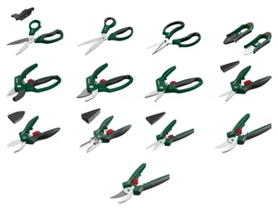 Nożyce wielofunkcyjne; Nożyce do warzyw; Sekator ogrodowy; Nożyce do ziół; Uniwersalny sekator ogrodowy z uchwytem palcowymi; Precyzyjny uniwersalny sekator ogrodowy; Precyzyjny sekator ogrodowy typu bypass; Nożyce do zbioru; Ząbkowane nożyce florystyczne : stal nierdzewna; Sekator kowadełkowy z uchwytem palcowymi; Sekator kowadełkowy z uchwytem palcowymi; Nożyce florystyczne : stal z powłoką zapobiegającą przywieraniu; Nożyce florystyczne typu bypass : stal Waga: Nożyce wielofunkcyjne : ok. 113 g; Nożyce do warzyw :