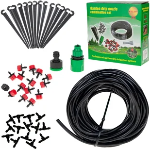 15-metrowy wąż z zestawem 15 dysz, które można zainstalować w zależności od potrzeb,Podłączenie odpowiednie dla dwóch rozmiarów kranów ½" i ¾",Wymiary opakowania: 30 x 30 x 7 cm,Szybka i łatwa instalacja dzięki dołączonym akcesoriom. Zestaw zawiera: wąż gumowy 15m,15x dysza punktowa,14x trójnik,16x kotwy mocujące,przyłącze węża ogrodowego,zestaw zacisków do węża,wymiary opakowania: 19 cm x 19 cm x 7 cm.