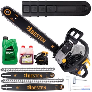 Idealny wybór zarówno do profesjonalnych, jak i domowych zastosowań. Gotowy zestaw Zestaw zawiera wszystkie niezbędne elementy, w tym olej do prowadnic oraz mieszankę paliwową. To sprawia, że piła jest gotowa do użycia od razu po rozpakowaniu, bez konieczności dodatkowych zakupów. Maksymalna moc i precyzja – Twoje idealne narzędzie do lasu, ogrodu i warsztatu BESTEN – niezawodność w każdej pracy z drewnem! Poznaj BESTEN BE0002865 – piłę spalinową, która łączy wyjątkową moc, niezawodność i wszechstronność. Dzięki niej każda praca stanie się prostsza, a cięcie drewna bardziej efektywne.