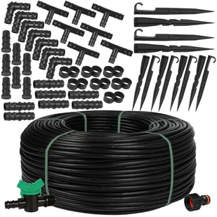 - 1 x ½" przyłącze na kran - 1 x ½" zaworek z przyłączem do linii 16mm - 50 x kotwica 16mm długość 18cm - 7 x łącznik 16mm - 7 x trójnik 16mm - 7 x kolanko 16mm - 7 x korek 16mm - 7 x łącznik (okular)