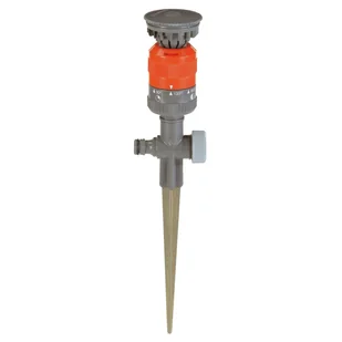 Kierunek zraszania można indywidualnie regulować. W celu nawadniania dużych powierzchni można połączyć ze sobą kilka zraszaczy. Zraszacz wykonany jest z wysokiej jakości materiałów. Jest zamontowany na szpilce z tworzywa sztucznego, gwarantującej pewne i stabilne mocowanie na trawniku. Może być wyjmowany i przenoszony w inne miejsce.