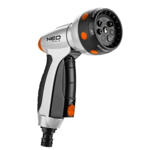 Zraszacz 7-funkcyjny NEO (nr ref. 15-706) przeznaczony jest do nawadniania m. in. trawników. Wyposażony jest w 7 funkcji podlewania, które pozwalają dopasować rodzaje strumienia do potrzeb: ciągły strumień, mgiełka, kilka strumieni ze środka, delikatne strumienie, prysznic, płaski strumień, rozproszony strumień. Pistolet posiada blokadę przedniej dźwigni dzięki czemu może pracować w trybie ciągłym. Uchwyt o ergonomicznym kształcie dobrze leży w dłoni i nie wyślizguje się, co podnosi komfort pracy.