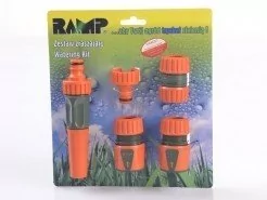 Przyłącze na kran 1", łącznik węża 3/4", dwie szybkozłączki do węża 3/4" (w tym jedna STOP), końcówka zraszająca.