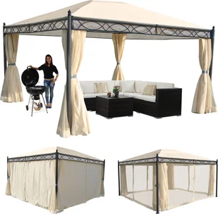 1x pergola z dachem, 4x ściana boczna i 4x moskitiera - Wytrzymała stalowa rama 7 cm - Ochrona przed promieniowaniem UV: 50 - Regulowana ochrona przed wiatrem i owadami - Ozdobne metaloweReplika acje - Stalowa rama malowana proszkowo Wymiary (w przybliżeniu): 3x3m: HxWxD 290x300x300 cm 4x3m: wys. x szer. x gł. 273x394x294 cm 4x4m: HxWxD 290x400x400 cm Grubość słupków: