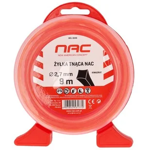 Żyłka marki Nac do kosy i podkaszarki w kształcie kwadratu o długości: 9 m i średnicy: 2. 7 m, która się zużyła. Doskonałym wyborem będzie żyłka, charakteryzująca się doskonałą wytrzymałością, a co za tym idzie, jest bardziej wydajna.