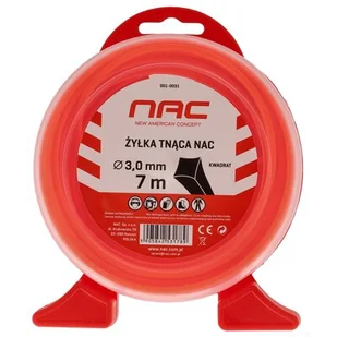 Żyłka marki Nac do kosy i podkaszarki w kształcie kwadratu o długości: 7 m i średnicy: 3 m, która się zużyła. Doskonałym wyborem będzie żyłka, charakteryzująca się doskonałą wytrzymałością, a co za tym idzie, jest bardziej wydajna.