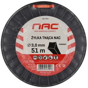 Żyłka marki Nac do kosy i podkaszarki w kształcie kwadratu o długości: 51 m i średnicy: 3 m, która się zużyła. Doskonałym wyborem będzie żyłka, charakteryzująca się doskonałą wytrzymałością, a co za tym idzie, jest bardziej wydajna.
