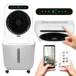wygodnie steruj klimatorem nie ruszając się z miejsca Zdalne sterowanie za pomocą Aplikacji: steruj zdalnie przy użyciu urządzenia mobilnego BUDOWA - WAŻNIEJSZE ELEMENTY Dotykowy panel sterowania Podświetlany wyświetlacz LED Kurtyna wodna Otwór do nalewania wody Wskaźnik poziomu wody klimatora Pilot + schowek na pilota Uchwyty ułatwiające przenoszenie Wylot powietrza z obrotową kratką ochronną Klipsy zabezpieczające Obrotowe kółka SKUTECZNE CHŁODZENIE EWAPORACYJNE Funkcja chłodzenia - wykorzystaj wodę dla lepszego efektu chłodzenia: idealne rozwiązanie na upały, efekt odczuwalny nawet2 razy szybciej w porównaniu do standardowych wentylatorów, nawilżenie powietrza ułatwia oddychanie oraz daje przyjemny efekt orzeźwienia, efektywniejsze oczyszczanie i jonizacja - zadbaj o swoje zdrowie i komfort. Jak działa chłodzenie ewaporacyjne? Klimator przepuszcza powietrze przez specjalnie wyprofilowany materiał, który został nasączony wodą pobieraną ze zbiornika. Chłodne powietrze jest rozprowadzane w pomieszczeniu, dzięki czemu szybko i efektywnie je schłodzisz.