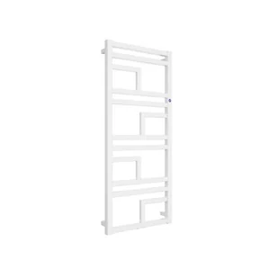 Płaski, prosty w formie grzejnik w kolorze białym. Kwadratowe kolektory i układ listew przypominający cegłę świetnie współgrają z nowoczesną, kwadratową armaturą.
