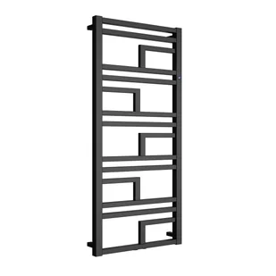 Płaski, prosty w formie grzejnik w kolorze czarny mat. Kwadratowe kolektory i układ listew przypominający cegłę świetnie współgrają z nowoczesną, kwadratową armaturą.