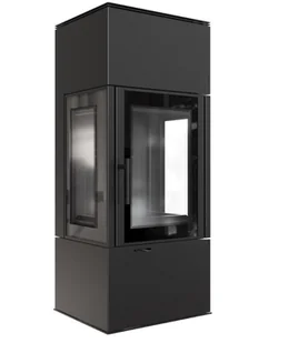 Trójstronne przeszklenie uatrakcyjnia wizję ognia, a dodatkowa ozdobna szyba typu glass podkreśla jego urok. Wnętrze pieca wyłożone Acumotte doskonale kontrastuje z bryłą, nadając całości nowoczesnego wyglądu.