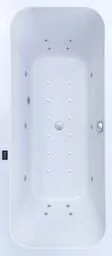 wanna z hydromasażem, prostokątna, dwuosobowa - do zabudowy głębokość wanny: 45 cm pojemność: 290 l MATERIAŁ WYKONANIA: korpus wanny wykonany z najwyższej jakości akrylu sanitarnego Lucite, kolor śnieżno-biały, powłoka antybakteryjna system rur płaskich NIBCO (zabezpiecza przed tworzeniem się osadów w orurowaniu wanny) zwiększona sztywność i wytrzymałość (od strony zewnętrznej wanna jest laminowana mieszanką włókien i żywicy) powierzchnia odporna na promieniowanie UV i matowienie powierzchnia akrylowa zapewnia łatwe czyszczenie i konserwację wanna osadzona na metalowym stelażu z regulowanymi nóżkami wszystkie dysze hydromasażu wodne i powietrzne wykonane z mosiądzu, kolor chrom połysk pokrętło systemu przelewowo-odpływowego oraz korek spustowy w kolorze chrom połysk DOSTĘPNE SYSTEMY HYDROMASAŻU: BASE STANDARD ADVANCED TWIN POWER Szczegółowy opis i porównanie systemów hydromasażu zamieszczono niżej w zakładce "PORÓWNANIE SYSTEMÓW HYDROMASAŻU" PARAMETRY ELEKTRYCZNE: