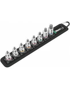 Wytrzymała zawieszka tekstylna wykonana w stylu charakterystycznym dla firmy Wera z 8 bitami nasadowymi i narzędziem do usuwania nakrętek do pracy w ograniczonych przestrzeniach. Płynnie działający mechanizm obrotowy dla pewnego mocowania i łatwego wyjmowania kluczy nasadowych. System oznaczenia kolorystycznego kluczy według rozmiaru "Take it easy" ułatwiający i przyspieszający odnajdywanie właściwego narzędzia. Wraz z metalowym karabińczykiem umożliwiającym mocowanie do szlufki lub torby. Wyjątkowo krótkie, stabilne bity nasadowe z zaletami technologii bitów Wera.