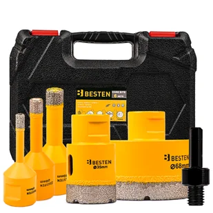 13 000 obr/min Adapter do wiertarki: W zestawie Zawartość zestawu 1x Otwornica 6 mm 1x Otwornica 8 mm 1x Otwornica 10 mm 1x Otwornica 35 mm 1x Otwornica 68 mm 1x Adapter do wiertarki 1x Walizka Najczęstsze pytania Jakie średnice otworów można wykonać za pomocą zestawu otwornic BESTEN BE-2821? Zestaw otwornic BESTEN BE-2821 umożliwia wiercenie otworów o średnicach: 6 mm, 8 mm, 10 mm, 35 mm i 68 mm. Czy otwornice z zestawu BESTEN BE-2821 pasują do szlifierek kątowych? Tak, otwornice z zestawu BESTEN BE-2821 posiadają uniwersalny gwint M14, który umożliwia szybkie i łatwe podłączenie do większości szlifierek kątowych. Z jakich materiałów wykonane są otwornice z zestawu BESTEN BE-2821? Otwornice z zestawu BESTEN BE-2821 wykonane są ze stali hartowanej i osadzone diamentami przy użyciu technologii próżniowego lutowania, co zapewnia wysoką wytrzymałość i trwałość.