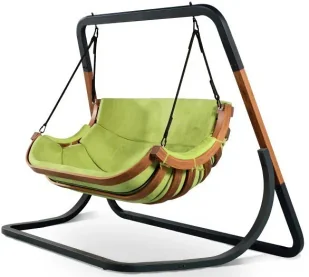 Stojak wykonaliśmy z wysokogatunkowego drewna modrzewia syberyjskiego i stali malowanej proszkowo, które cechują się bardzo dużą wytrzymałością i odpornością na zmienne warunki atmosferyczne. Poduchę uszyliśmy z najwyższej jakości wodoodpornego weluru Fancy 2S marki Elior.