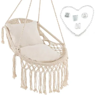 Łatwa instalacja dzięki zestawom mocującym: Instalacja jest uproszczona dzięki przemyślanym zestawom mocującym. Zestaw zawiera 4 śruby rozporowe do sufitów betonowych i 4 śruby do sufitów drewnianych, zapewniające solidne zamocowanie fotela bujanego. Solidne metalowe łańcuchy i wzmocnione metalowe karabińczyki umożliwiają łatwe zawieszenie, zarówno pod sufitem, jak i na stojaku do hamaków.