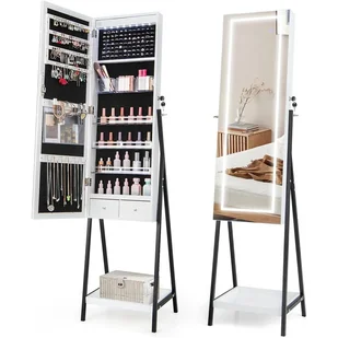 Dzięki tej szafce na biżuterię z lustrem 2 w 1 wszystkie kolczyki, naszyjniki, bransoletki, pierścionki i kosmetyki można uporządkować w tej szafce. Ponadto podświetlane lustro pełnej długości pozwala sprawdzić swój wygląd od stóp do głów. Kolor i jasność światła można łatwo regulować za pomocą przełącznika dotykowego. Aby chronić cenne przedmioty przed kradzieżą, szafka na biżuterię jest również wyposażona w zamykane drzwi i 2 klucze, które umożliwiają łatwe otwieranie i bezpieczne zamykanie. Stojący organizer na biżuterię z oświetleniem jest idealnym dodatkiem do sypialni, garderoby lub szatni!