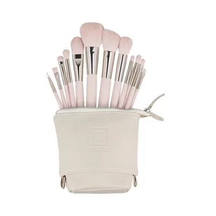 Pędzel do pudru Pędzel do różu lub bronzera Pędzel do rozświetlacza, różu lub pudru Pędzel do podkładu Pędzel do aplikacji korektora, pigmentów, pyłków, sypkich cieni i makijażu cut crease Pędzel do nakładania cieni do powiek Pędzel do nakładania cieni w kąciku oka i na dolnej powiece 2 pędzle do rozcierania i blendowania cieni Pędzel do makijażu brwi Precyzyjny (mniejszy) pędzel do makijażu brwi Pędzel do kresek Pędzle mają syntetyczne włosie, którego użytkowanie niesie mniejsze ryzyko reakcji alergicznych niż włosie naturalne. Włosie syntetyczne ma gładką strukturę, dzięki czemu pochłania niewiele produktu podczas aplikacji kosmetyków. Dodatkowo jest bardzo trwałe – ma większą odporność na odkształcenia i uszkodzenia. Zestaw wyposażony jest w etui o elastycznej konstrukcji. Ta funkcjonalna kosmetyczka doskonale sprawdzi się w podroży, a także posłuży jako organizer do przechowywania pędzli w domu.
