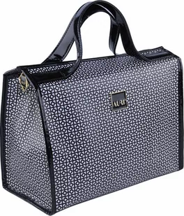 Kosmetyczka, torba, kufer Simple marki AURI. Posiada wygodną dużą komorę z wbudowanymi kieszonkami, która bez problemu pomieści wszelkie niezbędne kosmetyki, produkty pielęgnacyjne i higieniczne oraz mniejsze urządzenia jak suszarka czy depilator, dzięki czemu jest idealna w czasie podróży. Wyposażona została w uchwyty ułatwiające transport. Całość zamykana jest na zamek błyskawiczny w złotym kolorze z logiem producenta. Wykonana została z łatwego do czyszczenia materiału o wytłoczonej, geometrycznej fakturze w odcieniu bieli i czerni.