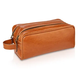 - doskonały design i nowoczesny wygląd Ręcznie szyta skórzana kosmetyczka VIAGGIO w kolorze jasny camel Ta luksusowa, ręcznie wykonana w Polsce podróżna kosmetyczka marki Betlewski® w odcieniu jasny camel, o prostym, nowoczesnym fasonie, to dodatek klasyczny i bardzo elegancki.