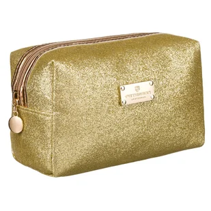 Kompaktowa, elegancka kosmetyczka damska z brokatowego materiału z akcentami w kolorze rosegold. Zamykana wygodnym, bezpiecznym suwakiem. Organizer jednokomorowy, wykończony podszewką, nie zawiera wewnętrznych kieszonek. Świetny na krótki wyjazd.