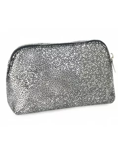 Kosmetyczka została wykonana z naturalnej, najwyższej jakości skóry o stalowym odcieniu, wzbogaconym o ozdobny wzór mozaiki. Zamykana na metalowy zamek błyskawiczny, w srebrnym kolorze.