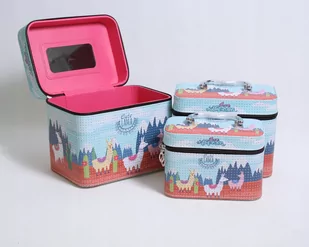 Zestaw trzech kuferków o różnych wielkościach - idealne do przechowywania kosmetyków, biżuterii czy różnego rodzaju innych bibelotów. Każdy kuferek posiada praktyczne lusterko, praktyczny zamek błyskawiczny oraz uchwyt do przenoszenia. Kuferek wykonany jest z wytrzymałego, sztywnego materiału - doskonale zapewni ochronę przedmiotom znajdującym się wewnątrz. Środek wyściełany miłym w dotyku materiałem. Cały zestaw jest bardzo praktyczny - każdy mniejszy kuferek można schować w środku większego.