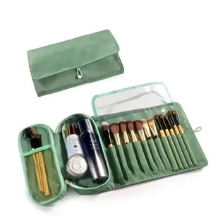 Dzięki pętelce, etui na pędzle można zawiesić na haczyku obok lustra i sięgać wygodnie w trakcie wykonywania makijażu po odpowiednie akcesoria do make up'u. Kosmetyczka jest bardzo ładnie i starannie wykonana. Po zrolowaniu i zapięciu wygląda jak bardzo elegancka torebka koktajlowa. Wymiary kosmetyczki: wysokość: 22 cm szerokość części przeznaczonej na pędzle: