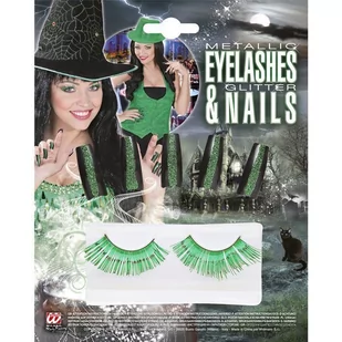 Zestaw zawiera: -sztuczne rzęsy w kolorze zielonym, -paznokcie czarne z zielonym brokatem.; Zestaw zawiera: -sztuczne rzęsy w kolorze zielonym, -paznokcie czarne z zielonym brokatem.