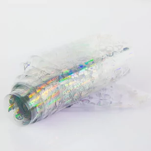 FOLIA TRANSFEROWA pasek ok 100 cm x 4 cm Pozwala w łatwy sposób osiągnąć oszałamiający efekt. Folię można kłaść na paznokcie w całości bądź też użyć jej elementów do stworzenia metalicznych wzorów. Do stosowania na lakierze hybrydowym bądź żelu. Naklejamy ją na warstwę dyspersyjną i pokrywamy nabłyszczaczem. Można dzięki nim osiągnąć efekt złotych, srebrnych, metalicznych, holograficznych paznokci, a także wiele innych, zależnie od potrzeby i fantazji.