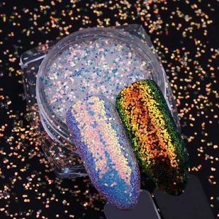 Efekt Pixie Dust to lśniący multikolorowy pyłek. Na paznokciach daje efekt iskrzących drobinek mieniących się wieloma kolorami! Ich odcień zmienia się w zależności od kąta padania światła. Efekt Pixie Dust jest bardzo prosty w aplikacji i można go stosować na wszystkie odcienie lakieru. Pixie Dust 03 Odcień: opalizujący na złoto Sposoby aplikacji: