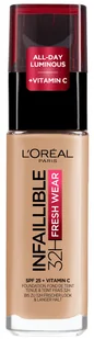 Wybierz nowy, jeszcze bardziej długotrwale kryjący podkład do twarzy z dodatkowym efektem rozświetlania. L'Oreal Paris Infaillible 32H Fresh Wear z SPF 25 to produkt, który pozwoli Ci cieszyć się niezawodnym makijażem aż do 32 godzin. Świeża, naturalna skóra przez cały dzień, a nawet dłużej to efekt lekkiej i oddychającej formuły podkładu, odpornej na ścieranie i zmianę koloru. Według badań, 92,9% kobiet potwierdza, że podkład sprawdza się idealnie także przy noszeniu i zdejmowaniu maseczki, 94,2% zapewnia idealną i nieskazitelną cerę, a dla 80,2% kobiet skóra jest promienna nawet po wysiłku fizycznym. Nowy Infaillible 32H Fresh Wear ma to samo satynowe wykończenie, lecz dzięki mikro perełkom rozpraszającym światło, cera jest bardziej promienna, a dodatek witaminy CG sprawia, że z czasem staje się jeszcze bardziej rozświetlona.