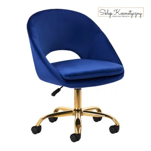 Proste wykończenie sprawia, że mebel wpada w oko. Przyjemne w dotyku, welwetowe obicie w odcieniach granatu nadaje mu wyjątkowego charakteru. Podstawa w odcieniach złota dodaje elegancji, idealnie komponując się z welwetem, a funkcjonalne koła zapewniają mobilność, ułatwiając przestawianie krzesła oraz poruszanie się po salonie w trakcie pracy. Estetyka wykonania, komfort użytkowania oraz ergonomicznie wyprofilowane oparcie sprawiają, że krzesło spełni wymagania nawet najbardziej wymagających użytkowników.