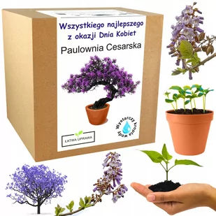 Zestaw do uprawy Bonsai Paulownia Cesarska - prezent na Dzień Kobiet Łatwy w uprawie i utrzymaniu Paulownia cesarska lub inaczej drzewko szczęścia to niezwykle dekoracyjne i okazałe drzewo. Według feng-shui obdarzone jest wyjątkowo dobrą energią. Zdobiło cesarskie ogrody, a w Japonii jego wizerunki umieszczano na najważniejszych odznaczeniach państwowych. Kwiaty paulowni przybierają barwę liliowoniebieską, nieco jaśniejszą w środku. Ich dodatkową zaletę stanowi słodki, przyjemny zapach.