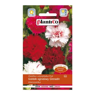 Nasiona kwiatów PlantiCo. Goździk ogrodowy Grenadin, mieszanka kolorów. Roślina dwuletnia, wysokości 30-70cm, kwiaty pełne, silnie pachnące. Wysiew nasion w maj-czerwiec do inspektu lub na rozsadnik, wymaga pikowania, na miejsce stałe wysadzamy w lipiec- sierpień. Wymaga gleb ciężkich, najlepiej w drugim roku po oborniku.