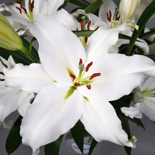 Lilia orientalna Pathos XL (18/20) 1 szt. Specyfikacja rośliny: Kolor: biały Okres kwitnienia: VI-VII Rozstawa sadzenia: 20 cm Termin sadzenia: IV-V/IX-X Zim...