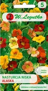 Nasturcja Niska Alaska mieszanka 3 g Roślina jednoroczna wysokości 20-30 cm silnie krzewiąca się o kulistym pokroju. O wartości tej formy stanowi kontrast ja...