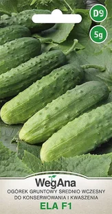 OGÓREK KONSERWOWY ELA F1 5g - WegAna Odmiana średnio wczesna, tworząca owoce jasnozielone, walcowate z rzadko rozsianymi dużymi brodawkami. Odmiana plenna ni...