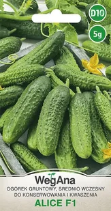 Ogórek konserwowy gruntowy Alice F1 5g - WegAna Odmiana średnio wczesna, tworzy owoce jasnozielone, walcowate, z rzadko rozsianymi dużymi brodawkami. Odmiana...