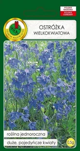 Roślina jednoroczna, kępiasta, o wzniesionych, rozgałęzionych pędach i głęboko powcinanych liściach. Kwiaty duże niebieskie z charakterystyczną ostrogą, lazu...