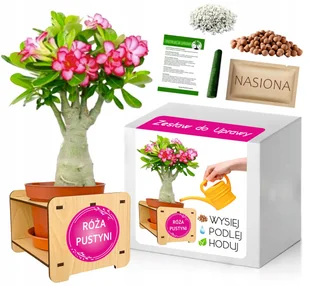 Zestaw do uprawy RÓŻA PUSTYNI + EKO PODSTAWKA Z NAKLEJKĄ POD DONICZKĘ (NOWOŚĆ!) Róża pustyni (Adenium obesum) jest rośliną z pustynnych terenów i kocha słone...