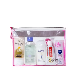 ** **-** składana szczoteczka do zębów - mini dezodorant Dove 35 ml - mini odżywka do włosów w sprayu Pantene 75 ml - mini szampon Dove 50 ml - woda micelarna 75 ml - mini pasta do zębów Colgate 20 ml