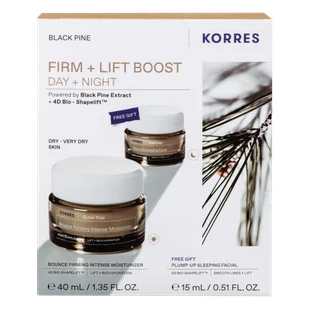 Korres Black Pine 4D Bio-ShapeLift™ zestaw prezentowy: krem na dzień 40 ml + krem na noc 15 mlPoznaj przełomową pielęgnację liftingującą od Korres — zestaw Black Pine 4D Bio-ShapeLift™ to duet stworzony z myślą o skórze, która potrzebuje ujędrnienia, nawilżenia i widocznej poprawy konturu twarzy. Bazując na 10-letnich badaniach nad długowiecznością czarnej sosny, Korres stworzył formuły, które skutecznie wspierają naturalne mechanizmy obronne skóry i przywracają jej młodzieńczy wygląd. Technologi