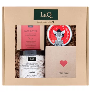 Masełko do twarzy, 50ml - odżywia i nawilża skórę twarzy. Masło do ciała, 250ml - intensywnie nawilża i zmiękcza skórę. Mus do mycia twarzy - łagodnie myje i odświeża cerę. Podaruj swoim bliskim odrobinę luksusu i naturalnej pielęgnacji dzięki zestawowi LaQ Pralinka. To idealny sposób, by pokazać, jak bardzo Ci na nich zależy!
