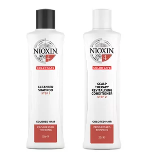 - szampon Nioxin System 4 Cleanser Shampoo 300ml - odżywka Nioxin System 4 Scalp Revitaliser Conditioner 300ml Oba kosmetyki, stosowane regularnie, są w stanie zmniejszyć liczbę wypadających włosów, zagęścić uczesanie, wzmocnić pukle oraz zrewitalizować całą czuprynę.